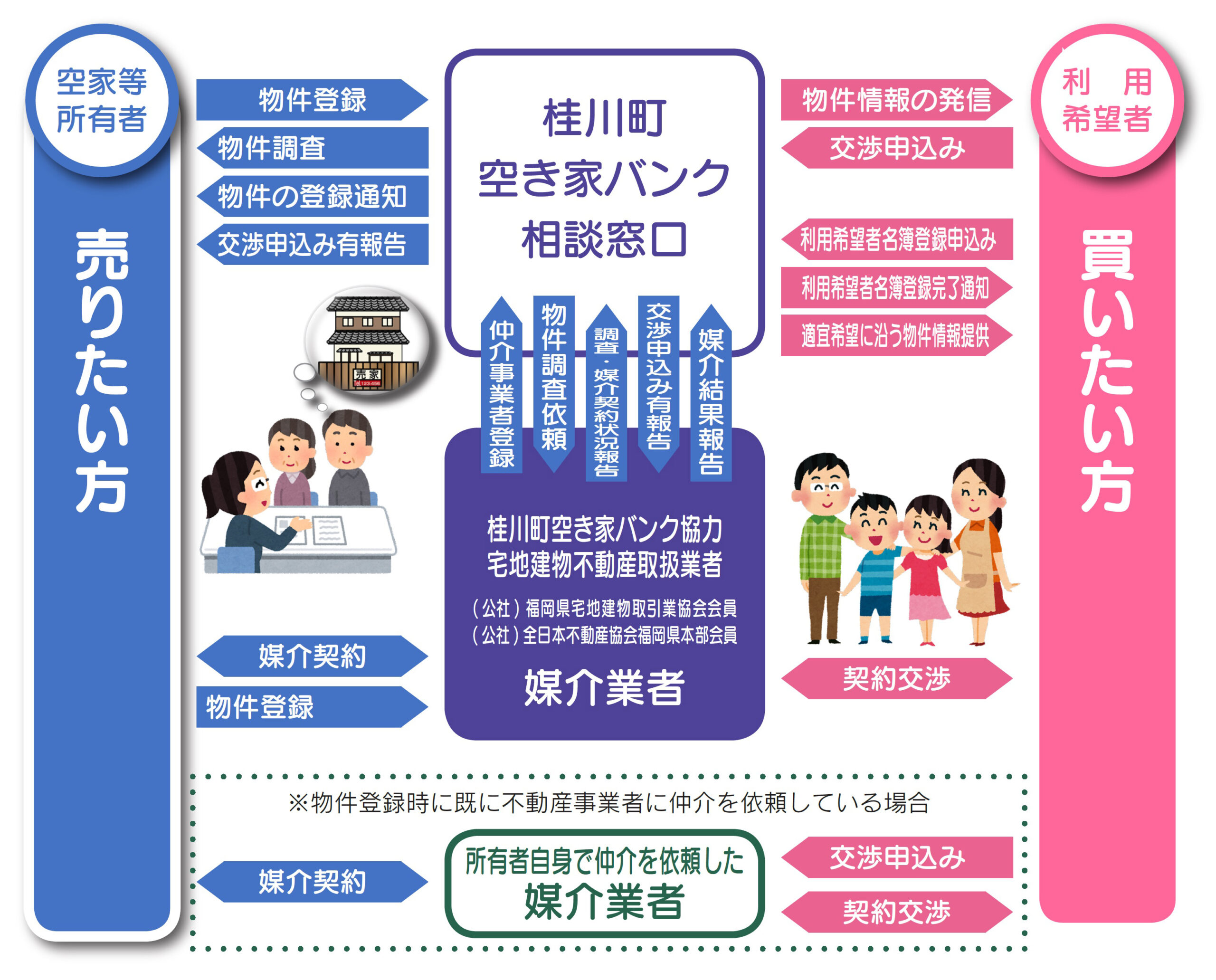 - 物件の売買契約(上図:「契約交渉」桃色矢印)は、町と連携している宅地建物不動産取扱業 、または所有者等自身で仲介を依頼した媒介業者が媒介を行います。成約時に、媒介手数料が必要となります。