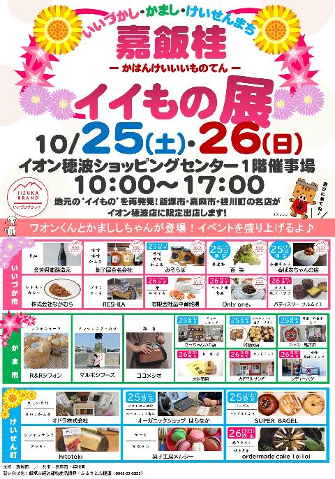 10月25日(土)26日(日)は、イオン穂波店にて「嘉飯桂イイもの展」を開催いたします。飯塚市・嘉麻市・桂川町の特産品やこだわりの逸品が勢ぞろい!試食やお店の方との交流を通じて、地元の“イイもの”を見つけに来ませんか?![]()