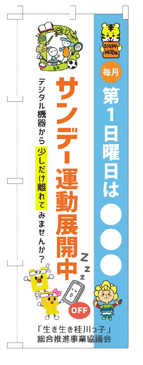 | 桂川町では、デジタルデトックスデイ運動(頭文字の3つのÐをとって通称「サンデー運動」)を、令和7年10月より実施しています。デジタルデトックスデイとは、心身の疲労やストレスを軽減したり子どもたちが健やかに育つ環境づくりを目的としています。毎月第一日曜日には、スマートフォンやパソコンなどのデジタル機器から大人も子どもも離れ、町全体で一斉にデジタル以外の活動に取り組みます。この活動が広がっていくように、ご理解とご協力をお願いします。 詳細については、下記関連ファイルをご覧ください。 〇統一実施日 毎月第一日曜日 〇DDD(サンデー)運動キャッチフレーズ 「第一日曜日は○○○」 第一日曜日は、いろんなことにチャレンジしましょう! 例えば、スポーツ、散歩、図書館で読書、絵をかいたり手芸をしたり、家族や友人とゆっくり会話を楽しむ、ヨガや瞑想で心と体を整えるなど、少しだけデジタルから離れて過ごしませんか。